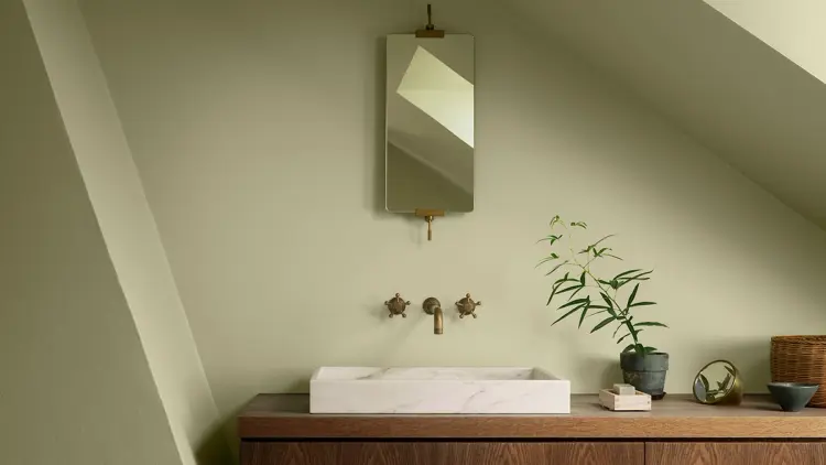 Bilder over: Baderomsplater fra Fibo i 4008 Beige Stone. Bad malt med våtromsmaling LADY Aqua matt i fargen 8596 Sunny Green fra Jotun. Foto: Fibo & JOTUN A/S