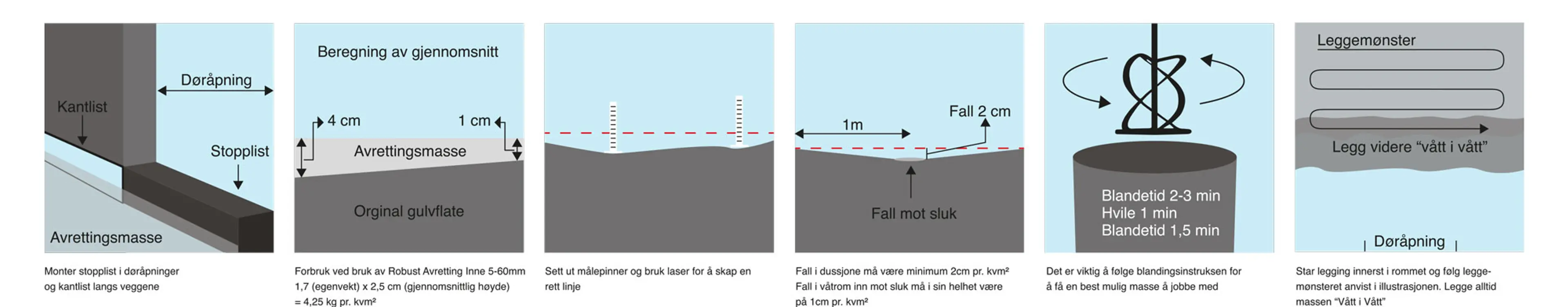 - Robust Avretting Inne 5-60 mm: For større ujevnheter innendørs. Passer for varmekabler og fall på baderomsgulv. Beleggingsklar etter 1 døgn.