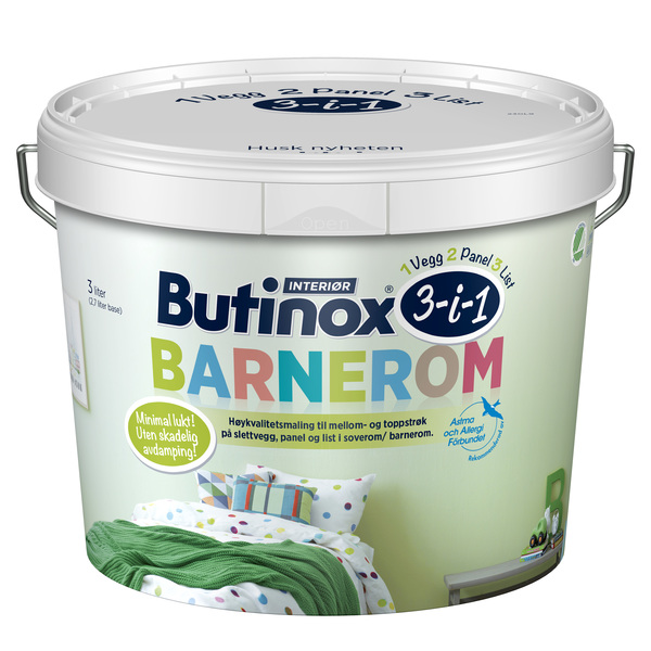 Butinox Interiør Barnerom er en inneklimavennlig, silkematt, løsemiddelfri akrylmaling med minimal lukt til innvendig bruk. Malingen kan brukes på flere typer underlag, enten det er vegger av glassfiber, tapet, bygningsplater, puss, betong, panel og lister.