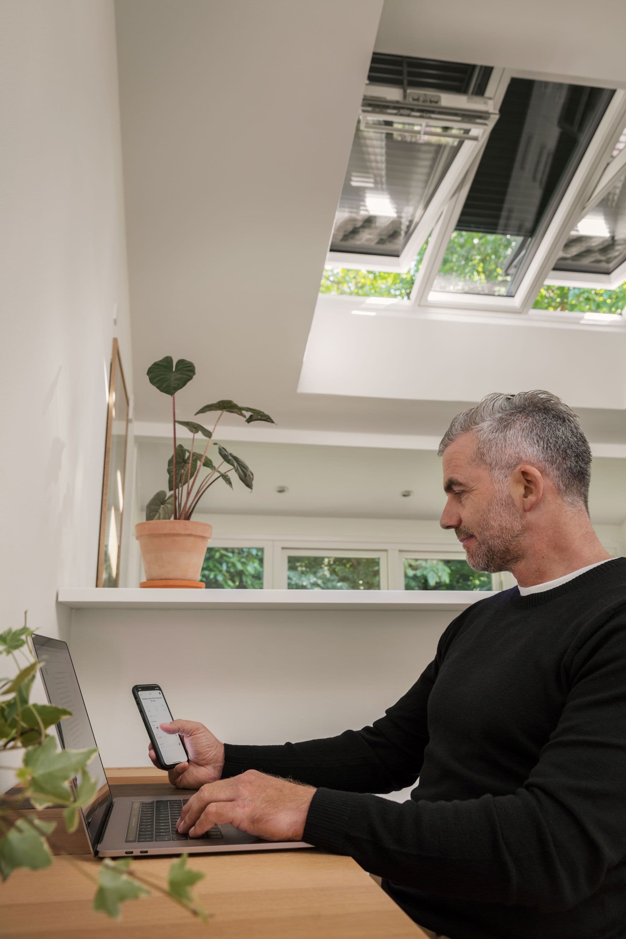 Betjen VELUX solcelledrevet 2i1 og 3i1 med den medfølgende veggbryteren. For best komfort betjenes vinduene med mobilen via VELUX App Control eller VELUX ACTIVE inneklimakontroll.