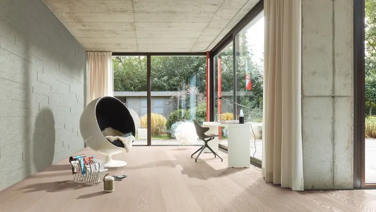 Bilder over: Mørke gulv gir en ro i rommet. Foto: Moelven & BOEN