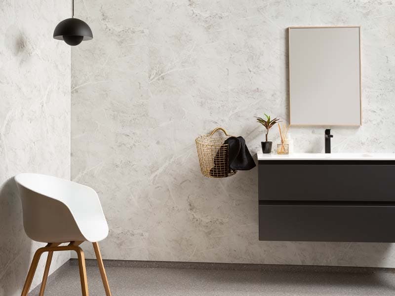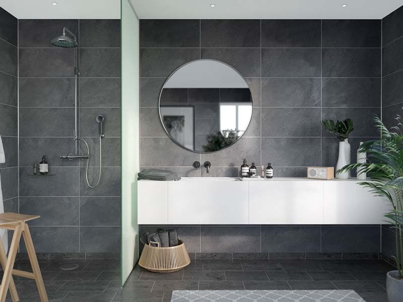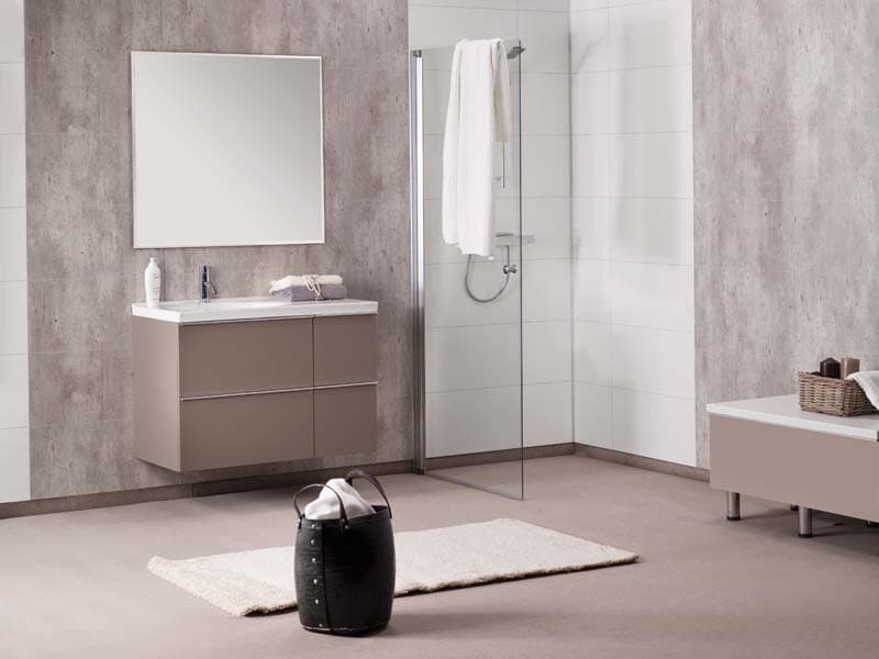 I Marcato-kolleksjonen til Fibo finner du design i tre, sement og ulike typer steinoverlater. Det fine med den dominerende trenden av marmor og betong på baderom er at du kan velge mellom flere dekorer og fargenyanser.