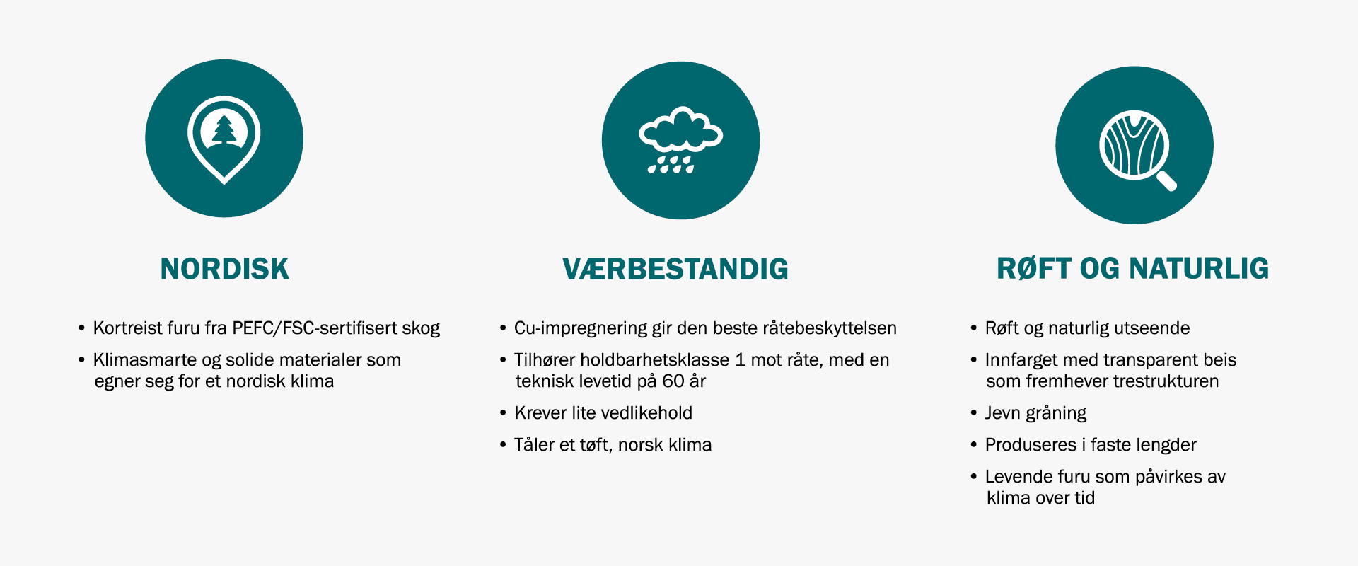 Værbitt kledning har de samme, gode egenskapene som furua den kommer fra. Det gjør at den tåler det tøffe klimaet landet vårt byr på, og står seg like godt i storm som i sol. Samtidig gir det røffe og naturlige utseendet huset en helt spesiell egenart.