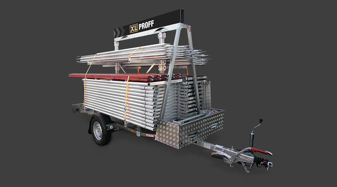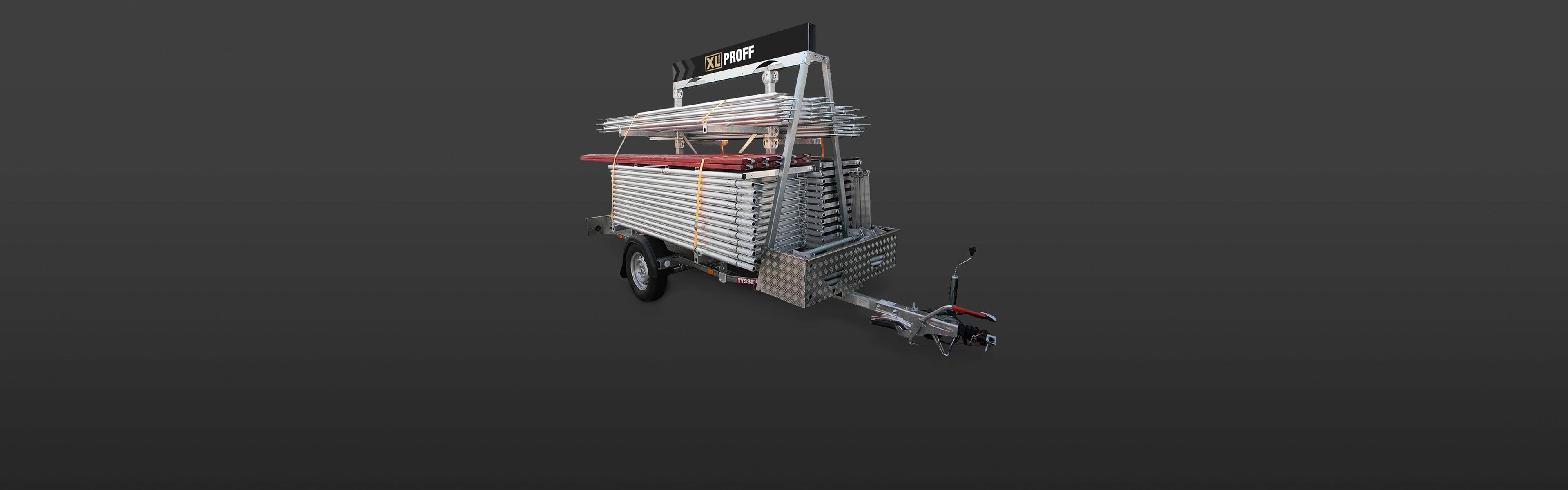 Stillaspakken kan leveres komplett på henger for enkel transport og lagring. Hengeren er påmontert verktøykasse for lagring av stillasdeler, og den rommer både enkel og dobbel stillaspakke. Hengeren leveres ferdig registrert.